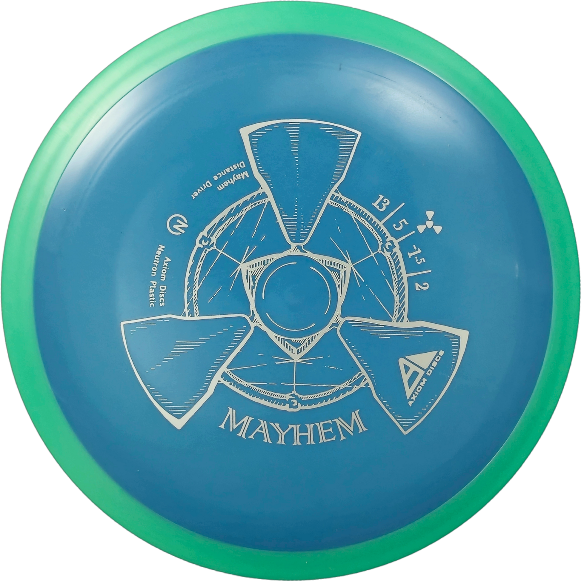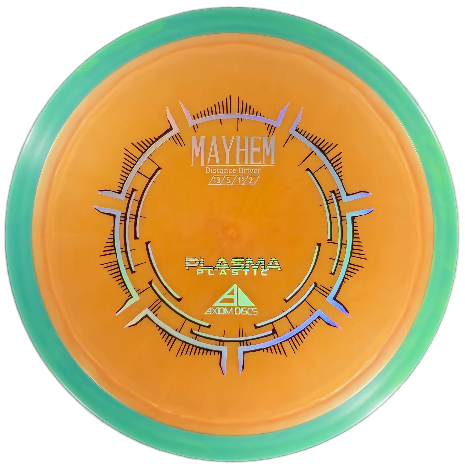 The Axiom Mayhem is a stable-to-understable distance driver built for long, consistent flights with minimal effort. With its turn-friendly flight and reliable fade, this disc is perfect for shaping lines and maximizing glide.