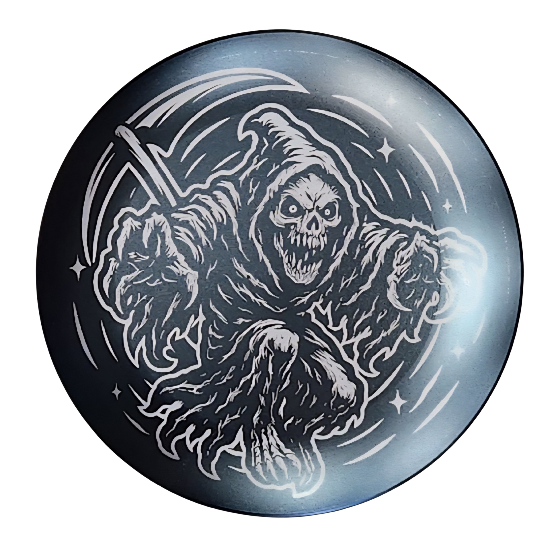 Bring a touch of darkness to your game with the Realm Reaper — a precision-engraved metal mini featuring a haunting reaper design cloaked in swirling cosmic detail. This piece captures the perfect blend of gothic energy and celestial artistry, ideal for those who like their disc golf gear with a little edge.