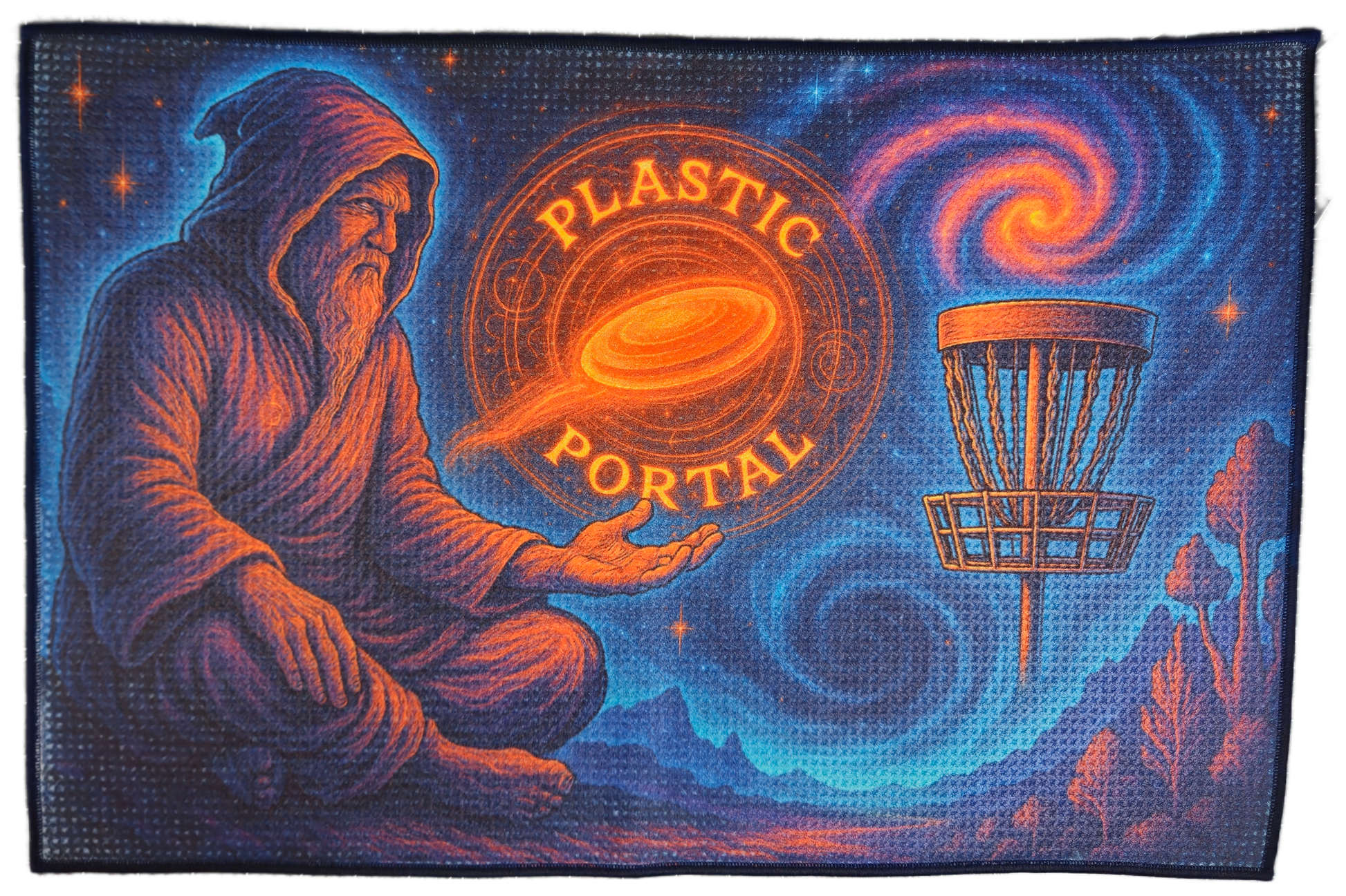 Channel cosmic focus with The Portal Sage. A hooded mystic conjures the glowing Plastic Portal emblem, casting it through a swirling galaxy toward the chains. With radiant color, celestial texture, and a touch of ancient power, this towel is a striking fusion of fantasy and disc golf. Designed and sublimated by The Plastic Portal, it’s a functional piece of interdimensional art for your bag.